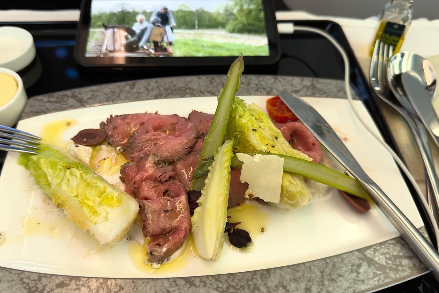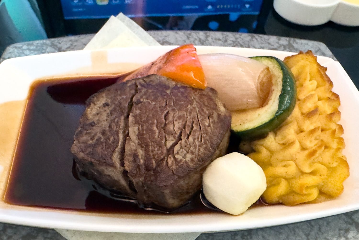 На борту ANA два варианта меню — азиатское и интернациональное. Я брал интернациональное. Длительный перелёт имеет свойство улучшать вкусовые ощущения: чем дольше сидишь, тем тщательнее жуёшь, и тем вкуснее кажется еда. Но объективно: всё качественно, подано аккуратно, без замечаний. Горячее — плотное, закуски простые, но добротные. На борту всегда доступен мисо-суп — без ограничений.