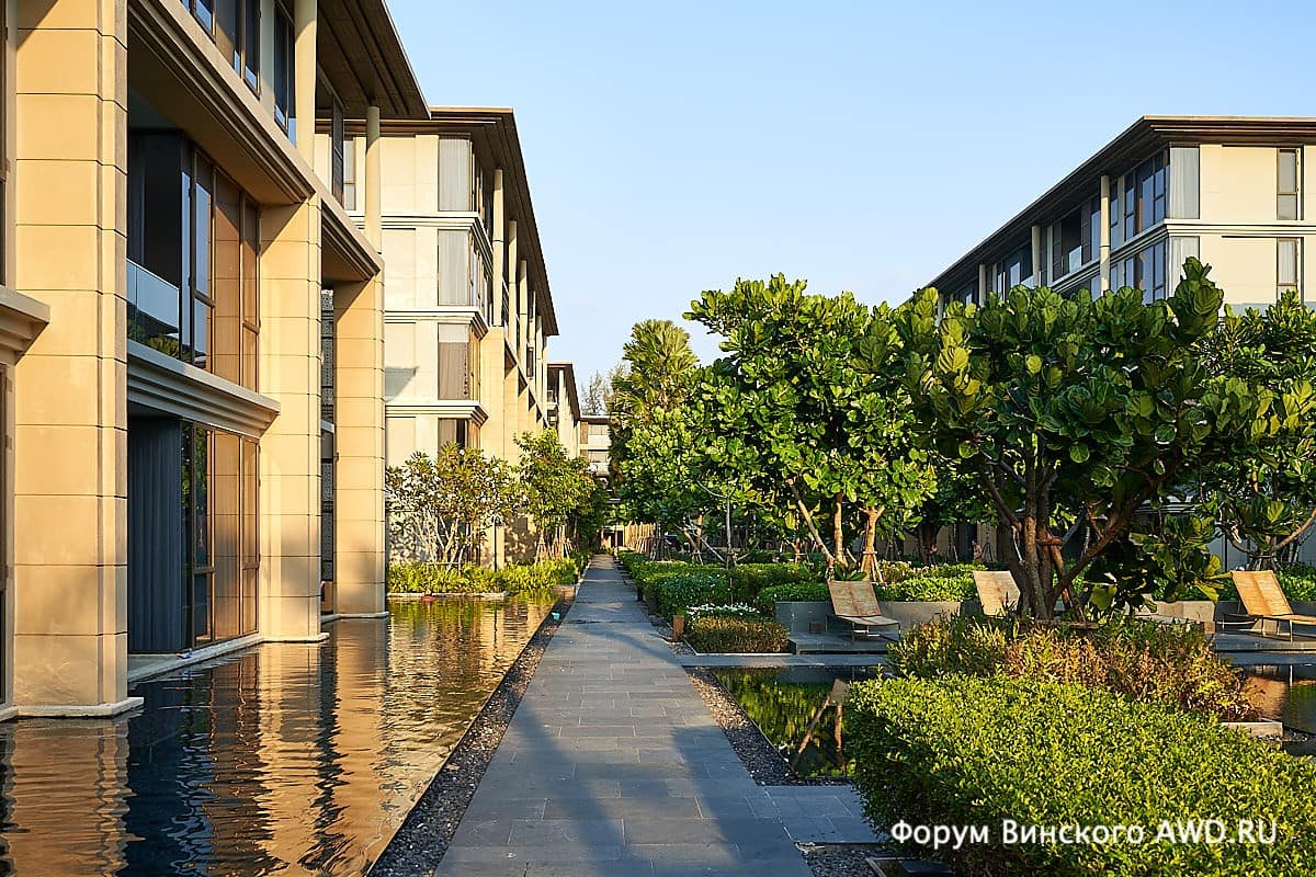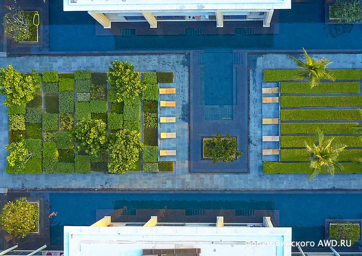 Между корпусами — бассейны, так что жители апартаментов на первом этаже прыгают в него из окна.