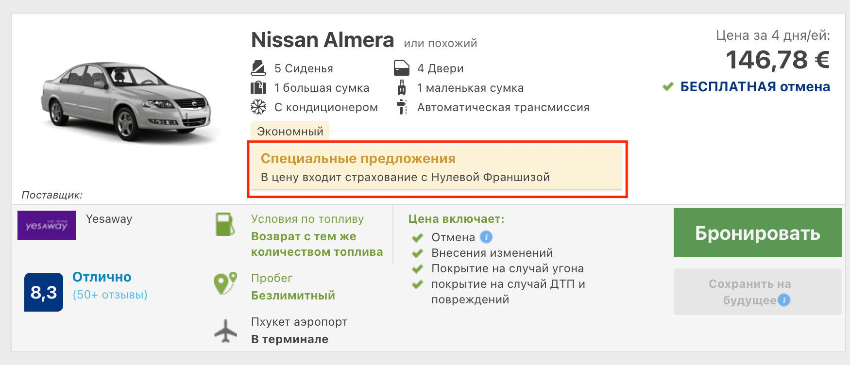 Совет: иногда на Discovercars полная страховка уже включена в цену (на жёлтом фоне есть пометка). Поэтому конечно лучше выбирать такой вариант.