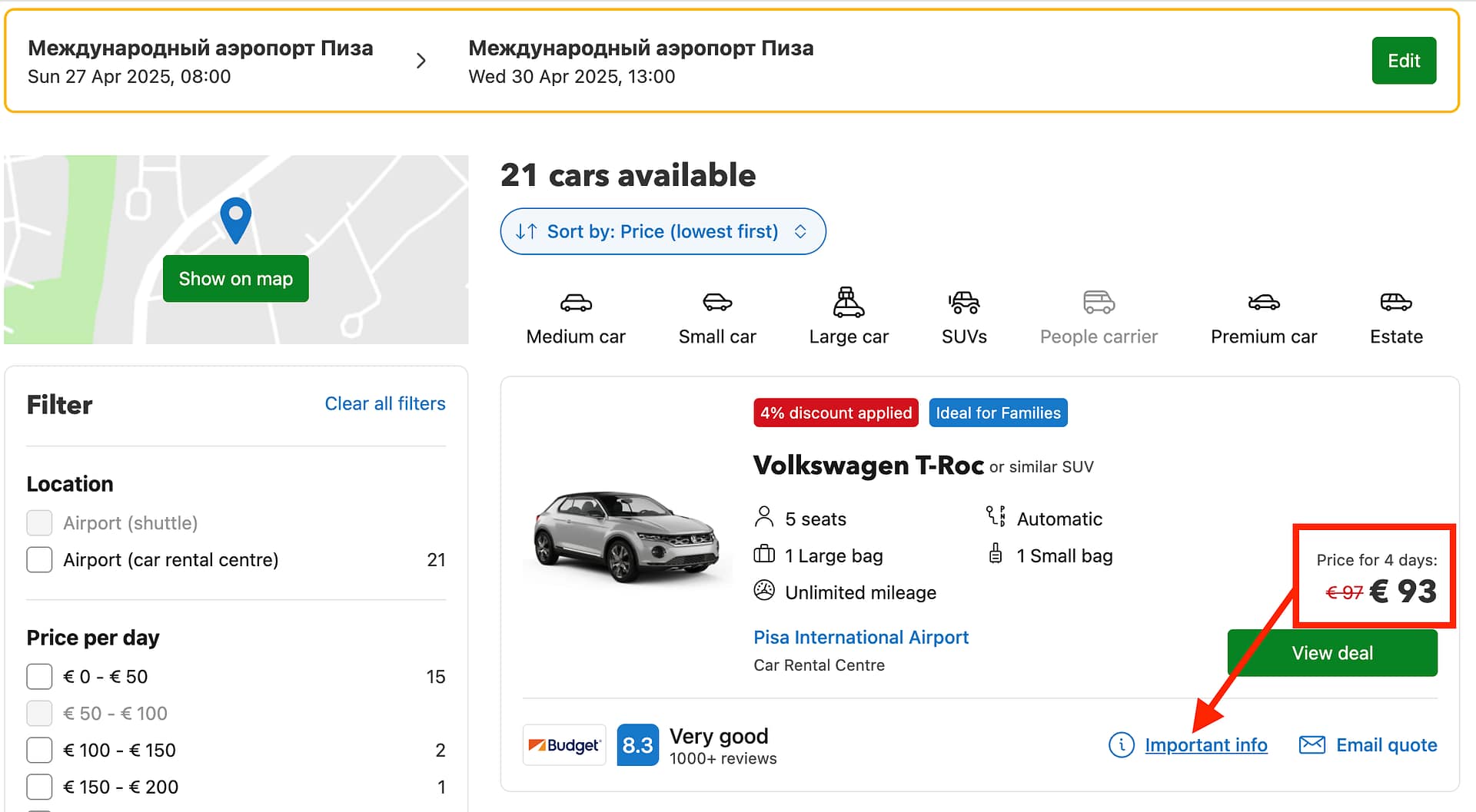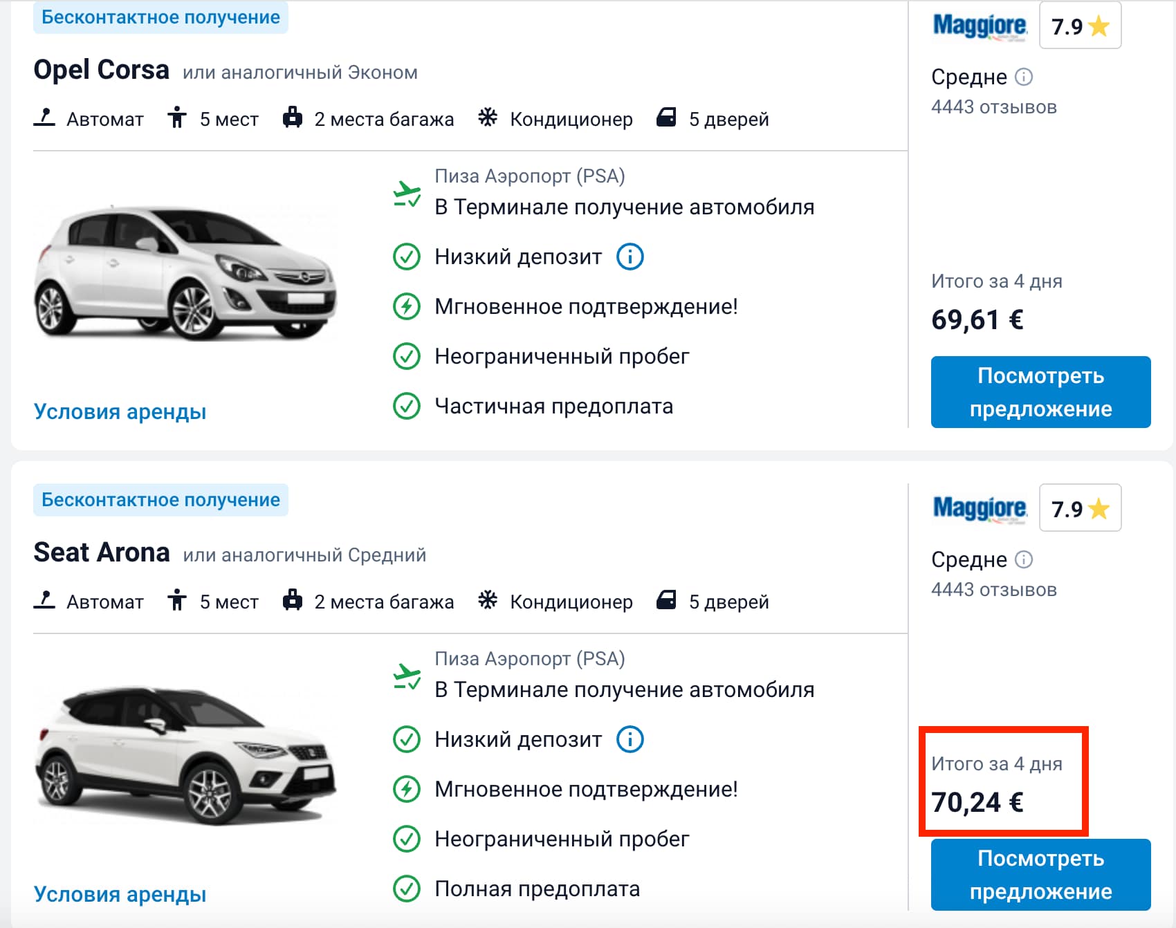 👌 Хотел попробовать другой агрегатор — пару недель назад здесь же (в Пизе) выиграл Ренталкарс.