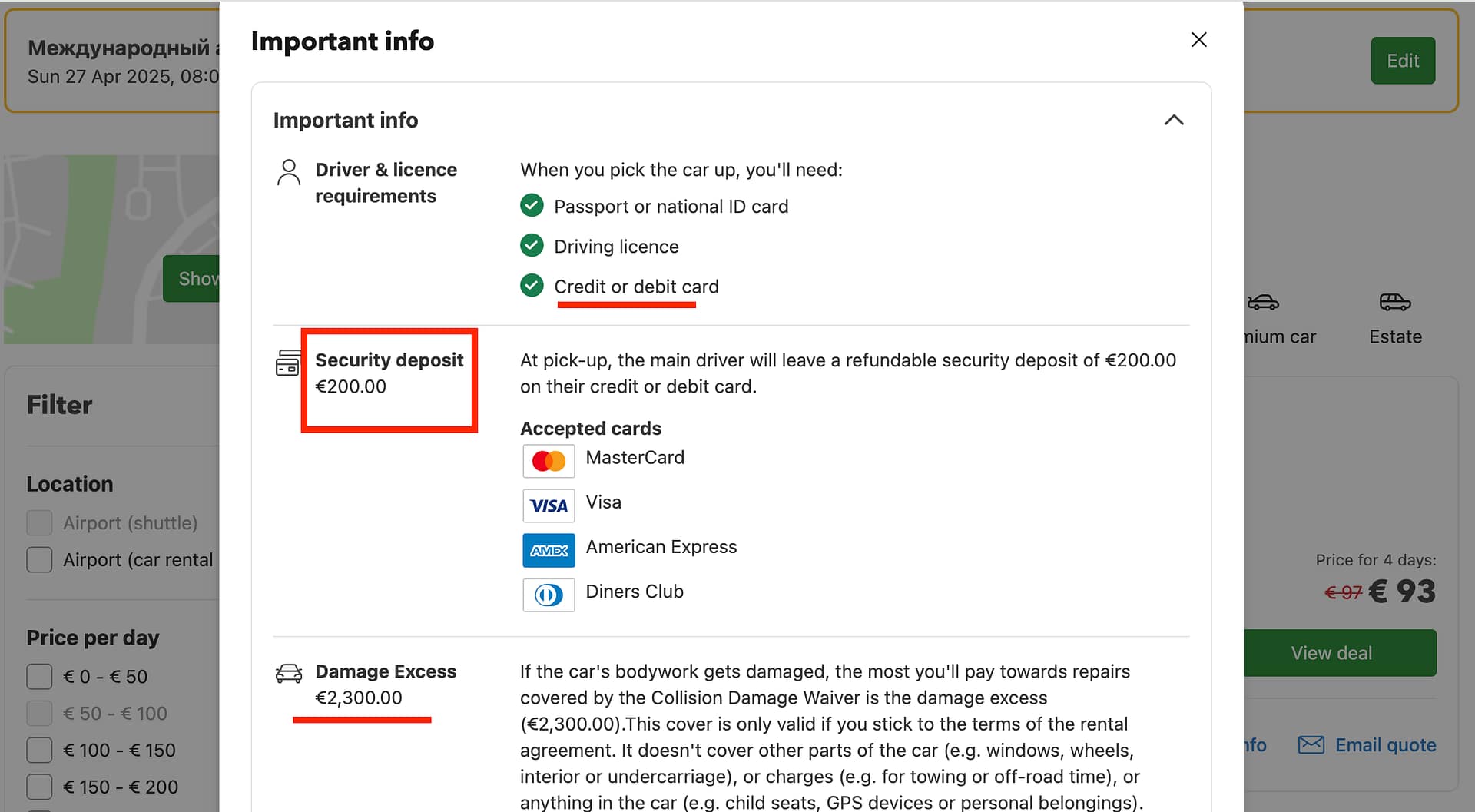 ✅ Следи за размером депозита и франшизы (лучше вообще без депозита, но тогда аренда будет минимум в 2 раза дороже).