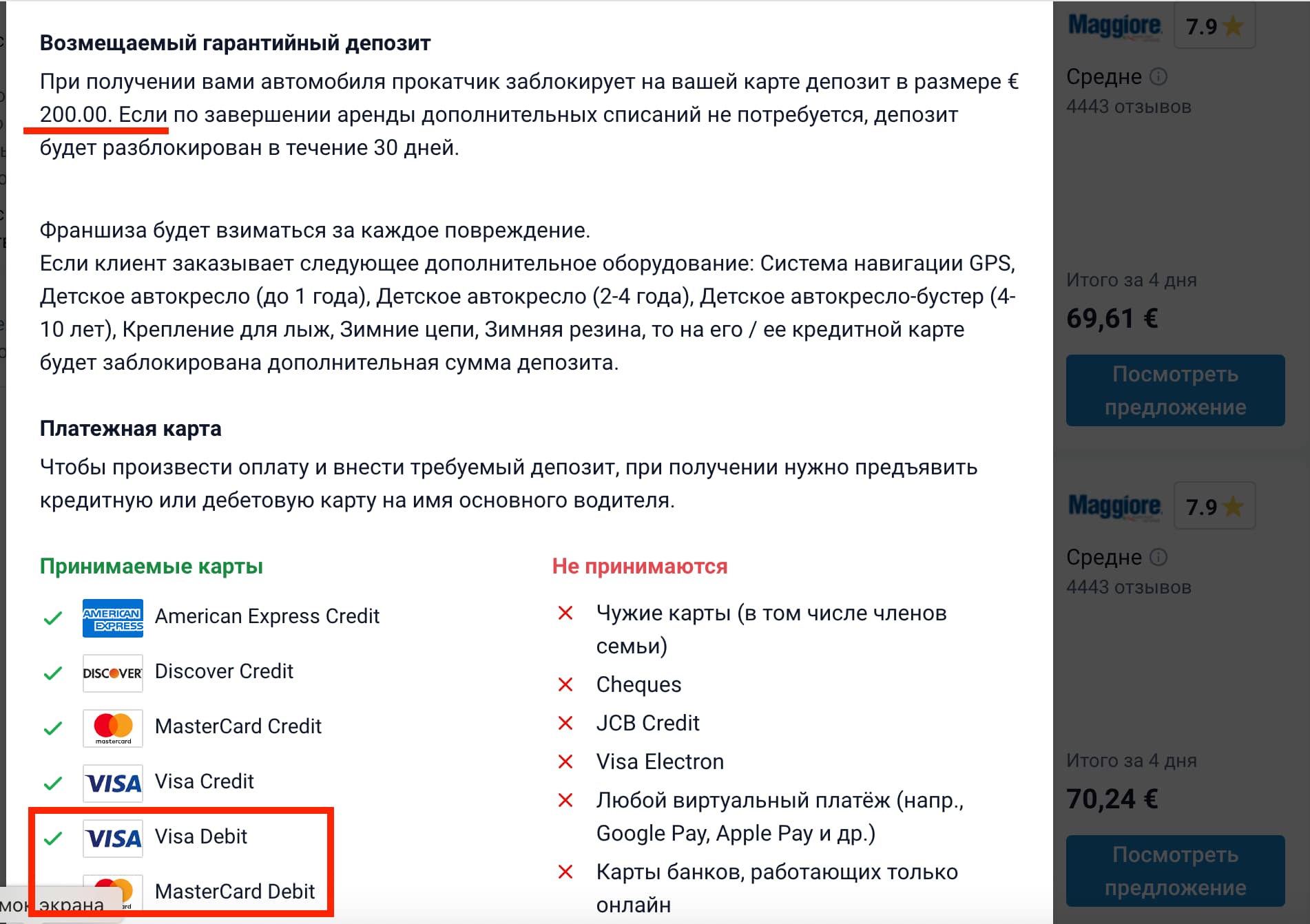 Важно: аренда оформляется без кредитной карты — для депозита принимается дебетовая карта.