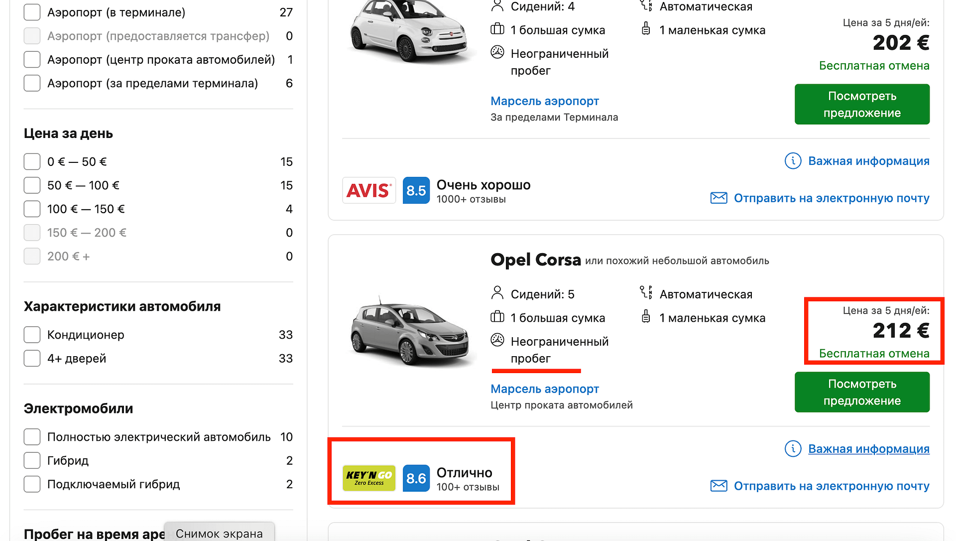 На сайте Ренталкарс нет фильтра «дебетовая карта», поэтому я использую фильтр «размер депозита 0-300 евро«.