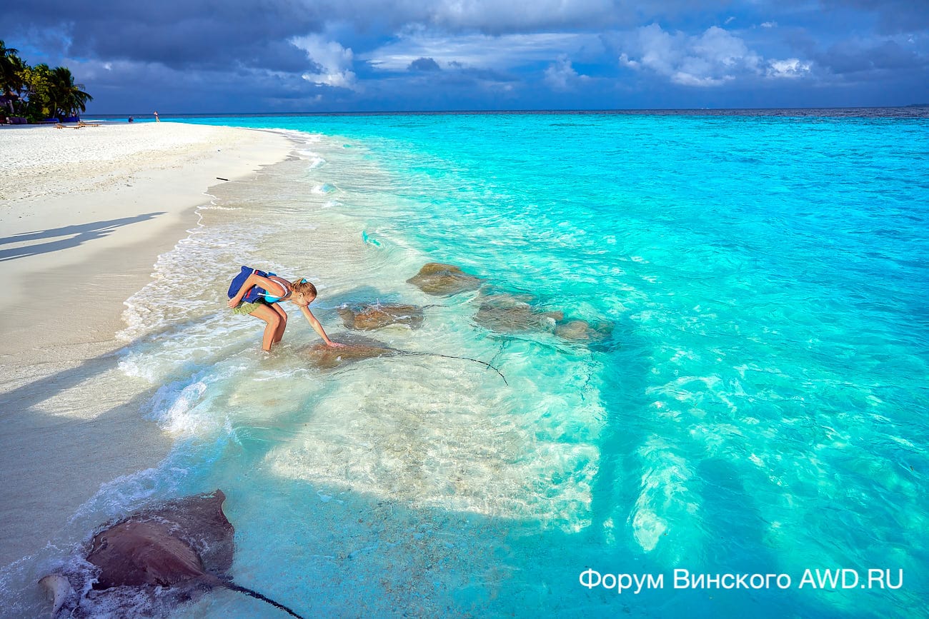 Ежедневно с 16:45 до 17:30 к пляжу рядом с главным причалом приплывает стая скатов.