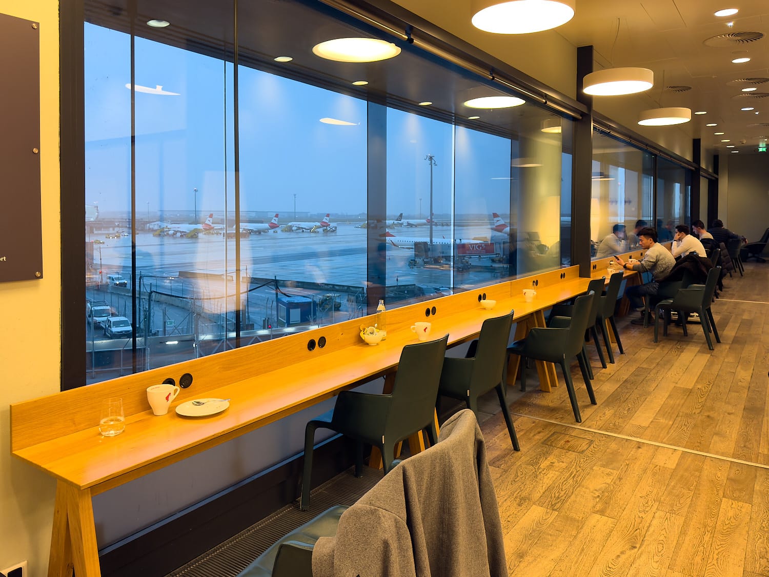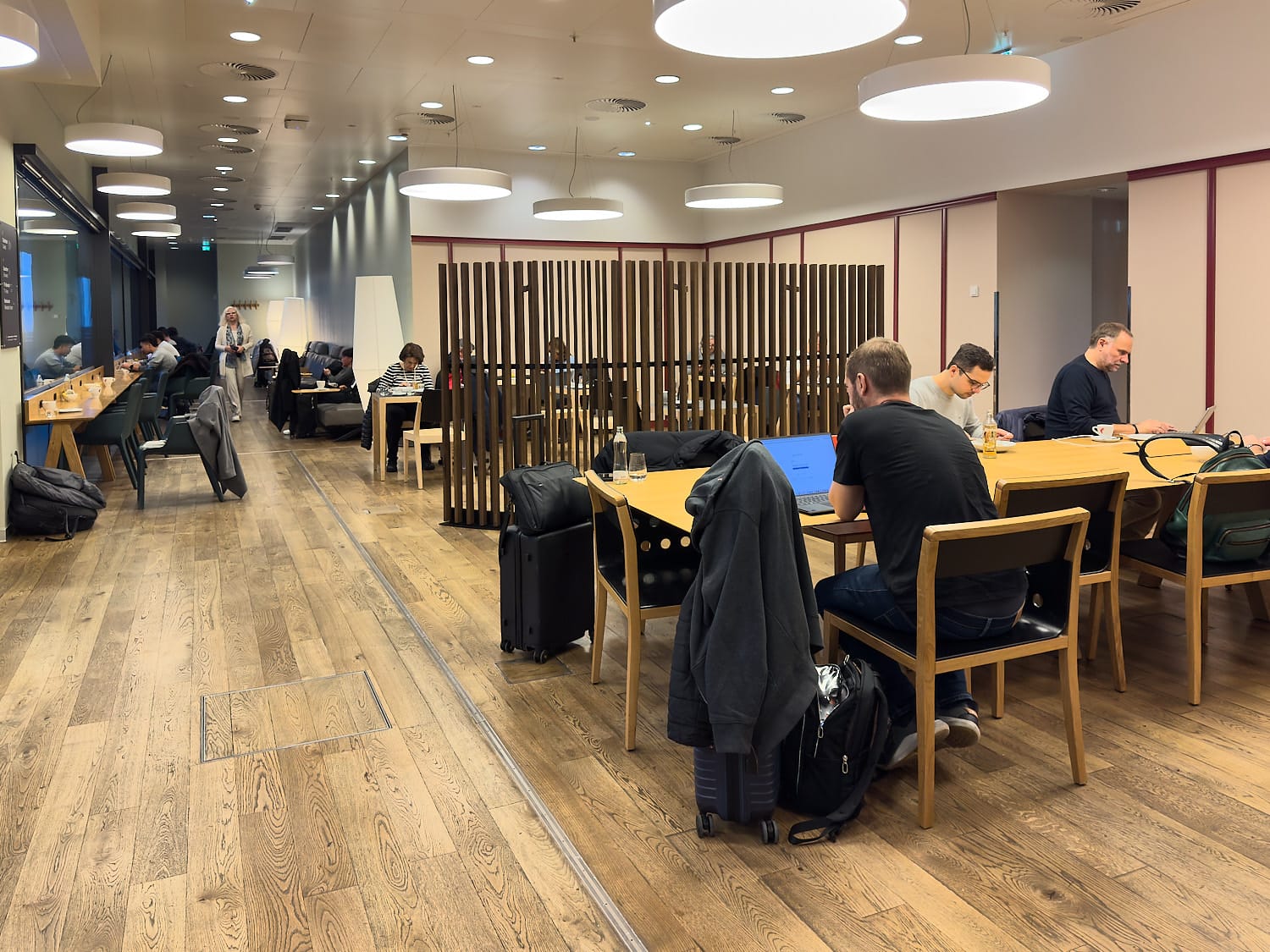 Зал подходит для спокойного ожидания рейса, работы за ноутбуком и перекуса. Однако спальных зон нет: мягких диванов, где можно прилечь, не предусмотрено.