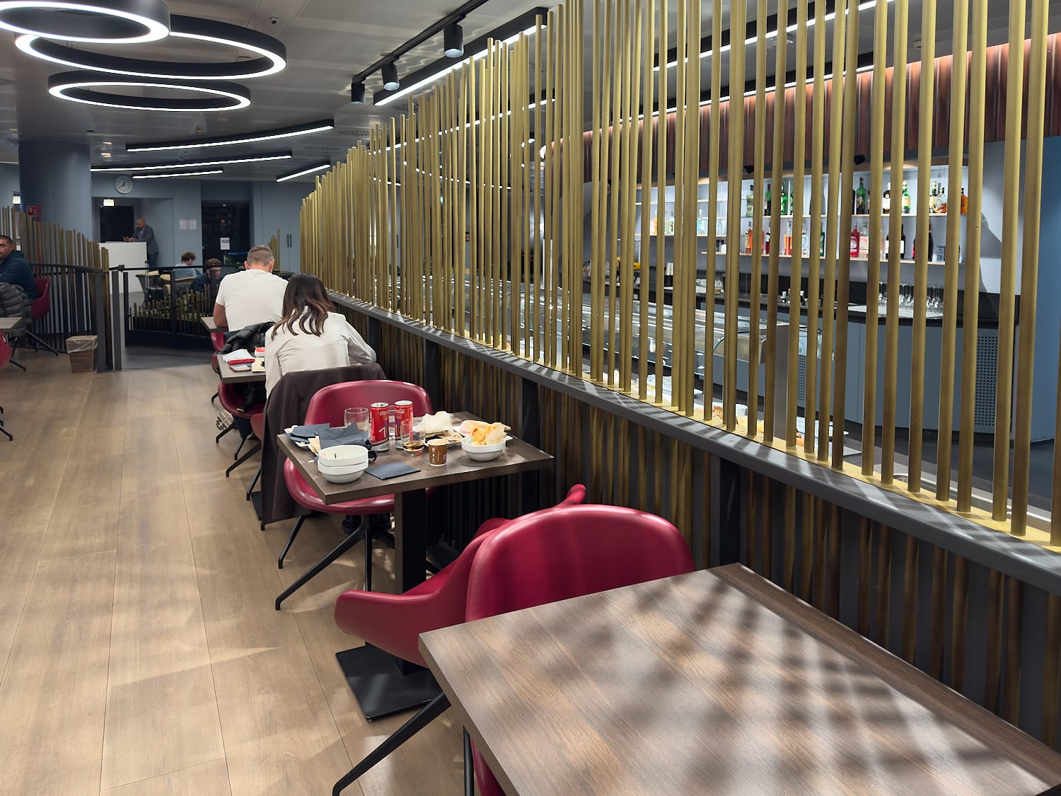 Рабочие места не предусмотрены: столики маленькие, поставить ноутбук неудобно. Wi-Fi есть, но скорость посредственная. Кресла жёсткие, звукоизоляция слабая, и общая атмосфера — «переждать рейс, но не отдыхать».