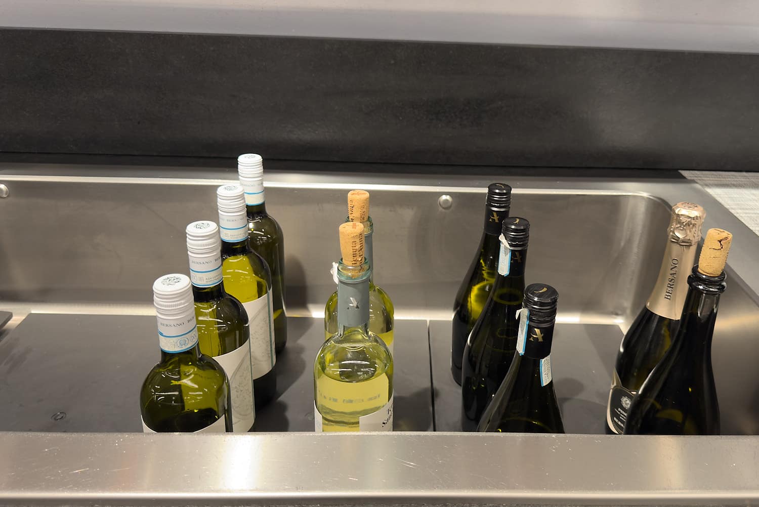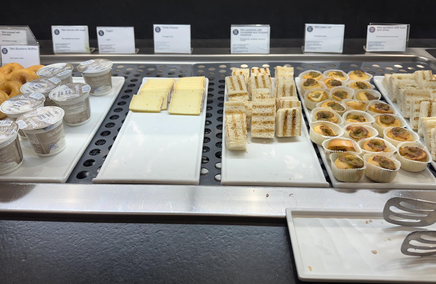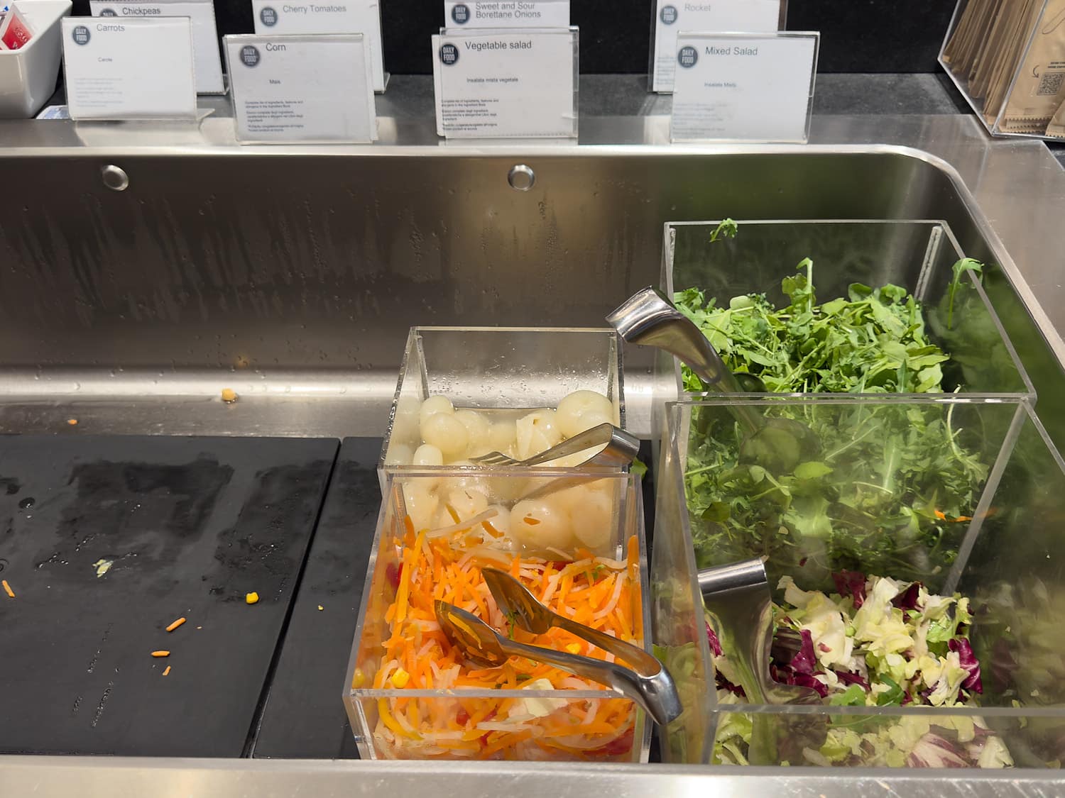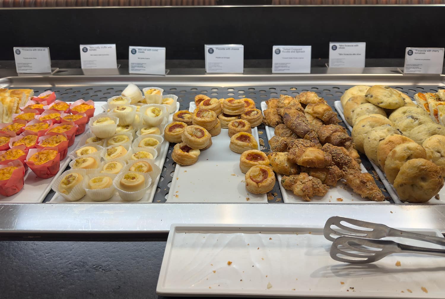 Из плюсов — две кофемашины, что в условиях Мальпензы уже достижение. Можно взять эспрессо, капучино или американо без очередей. Холодные напитки в холодильнике — по минимуму: вода, сок, газировка. Алкоголь подаётся на стойке, но выбор ограничен. Еда — скромная: булочки, крекеры и несколько упаковок йогурта. Горячих блюд нет, а слова «шведский стол» здесь лучше не произносить.