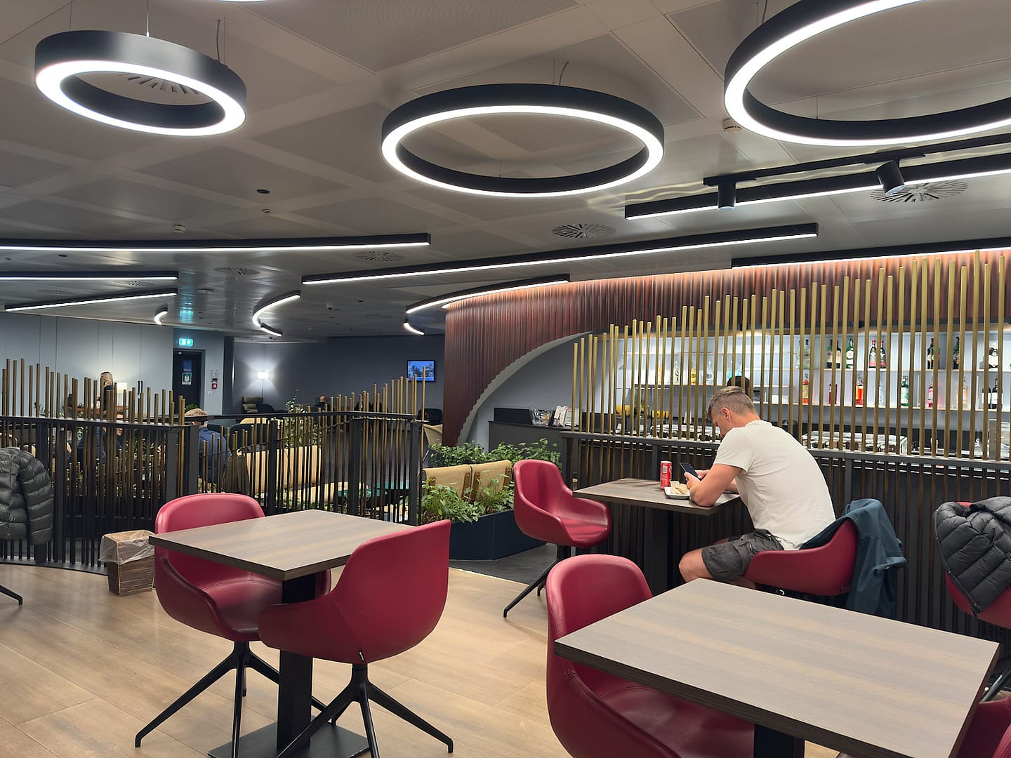 Интерьер — без изысков: низкие потолки, искусственный свет и ни одного окна. Атмосфера скорее напоминает офисную переговорную, чем бизнес-зал международного аэропорта. Вид из окна отсутствует, поэтому рассчитывать на «отдых с панорамой взлётной полосы» не стоит: (Бизнес-зал в аэропорту Турина)