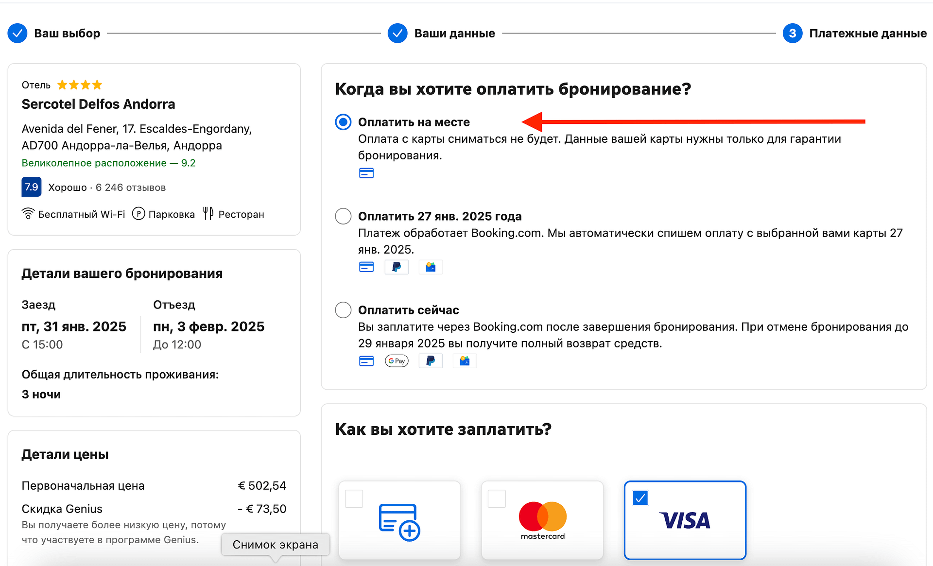 На последнем шаге бронирования, выбираю вариант оплаты «Оплатить на месте«.