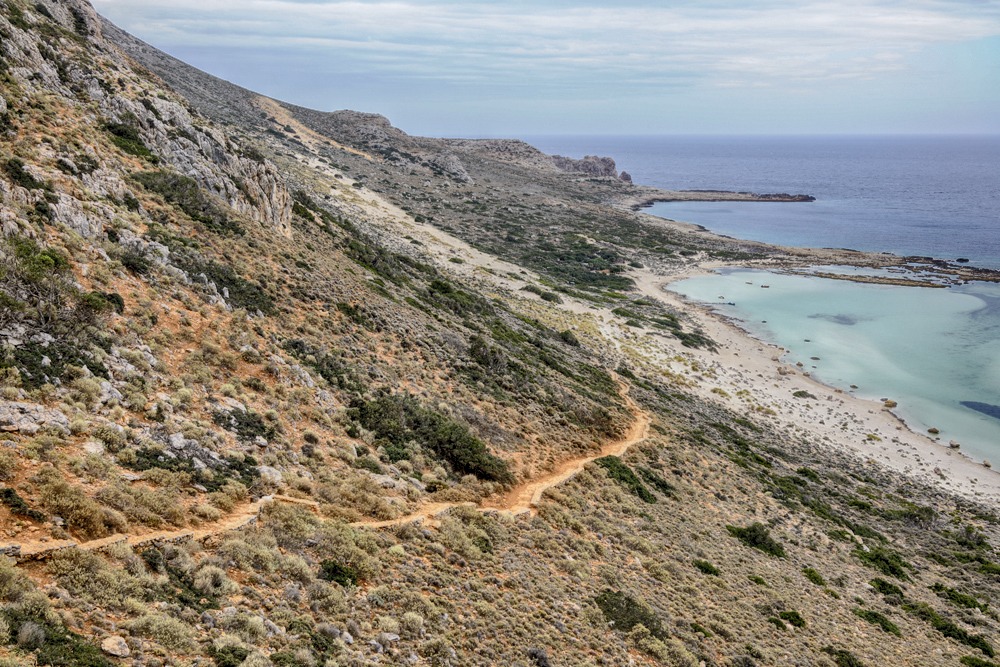 Трекинг от стоянки до лагуны Балос примерно 2 км пересеченной местности в конце которой спуск к пляжу: 2341 ступенька