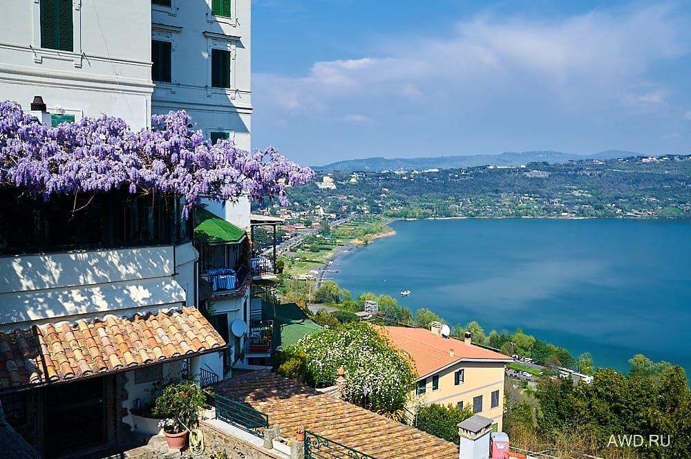Фасад города с обрыва смотрит на озеро Альбано (Lago Albano).