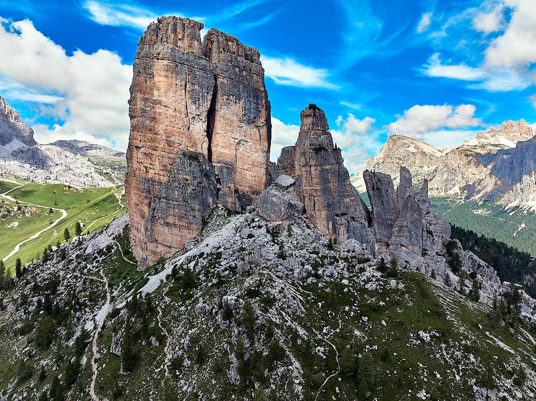 The Cinque Torri rock formation, a cluster of dramatic stone columns, is located about 30 minutes southwest of Cortina d’Ampezzo.