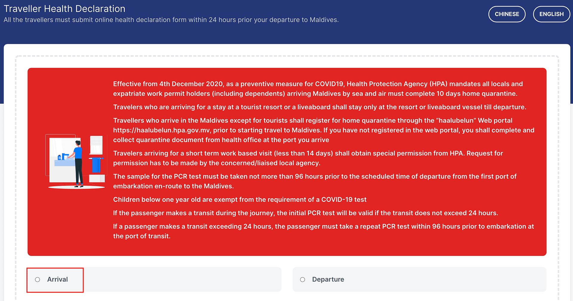 Не ранее чем за 24 часа до прибытия на Мальдивы, надо зайти на сайт https://imuga.immigration.gov.mv/ethd/create и заполнить простую форму.