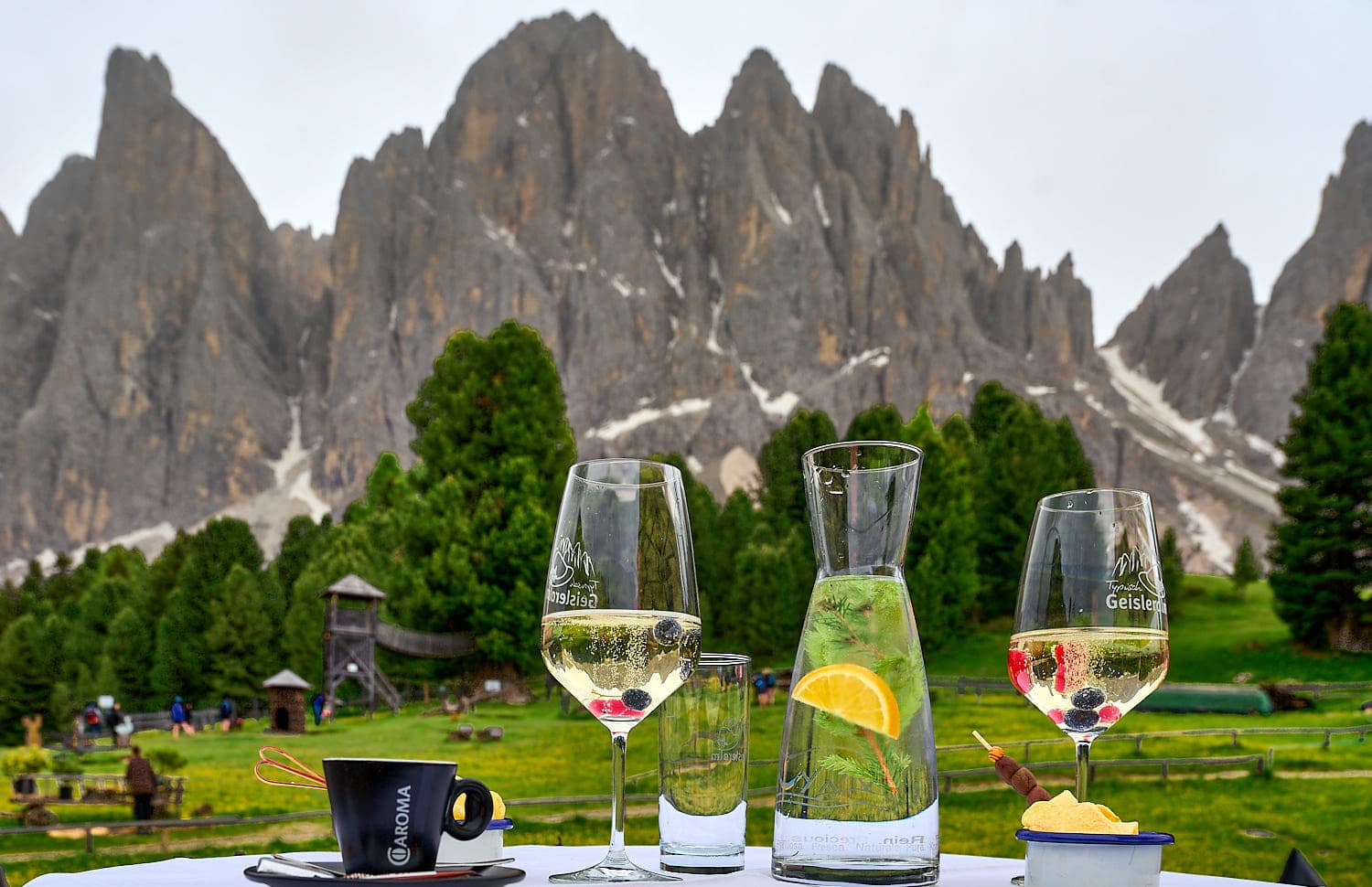 Ну, или полежать на деревянных шезлонгах можно, с видом на пики Гейслера, конечно.