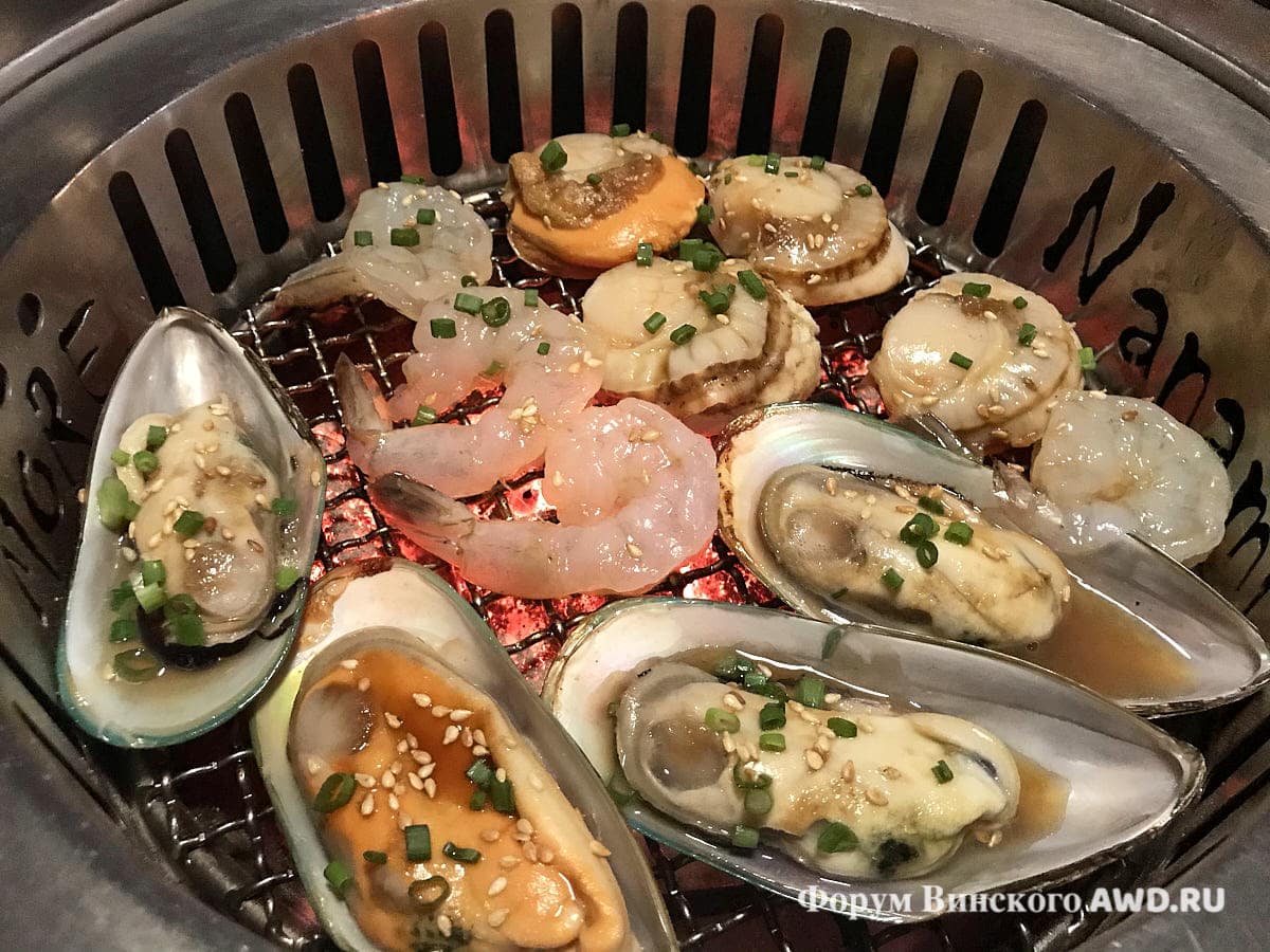 Мраморное мясо или морепродукты вы готовите на углях в жаровне, вмонтированной в стол.