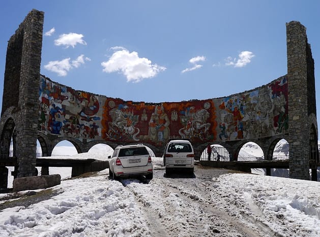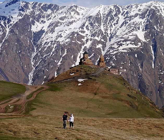Заехали мы в горы: через горнолыжный курорт Гудаури, за которым заканчивается асфальт и начинается разбитая дорога, что змеится мимо памятника советского зодчества в сторону горы Казбек и далее к границе с Россией — это единственный на сегодняшний день КПП, где можно пересечь границу.