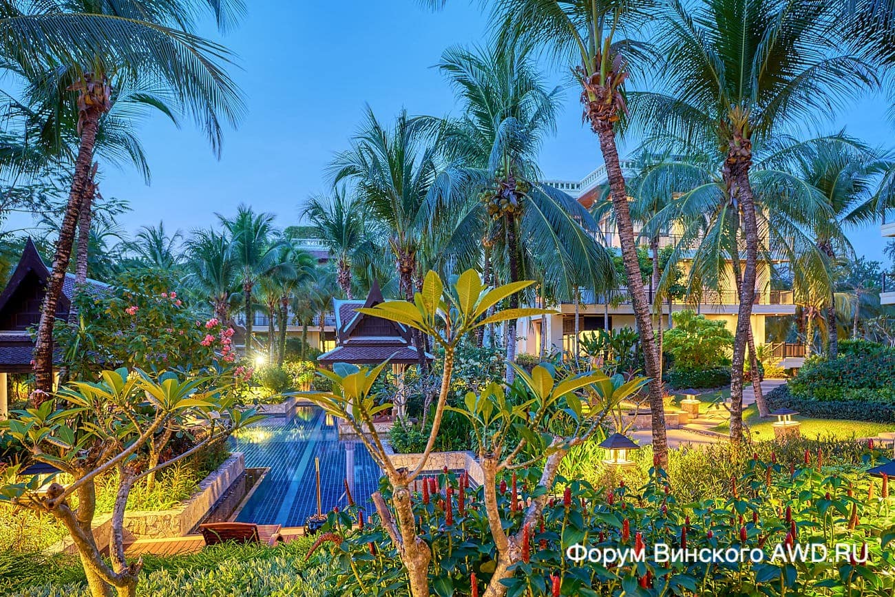 Построено в тайском тропическом стиле: площадь апартаментов от 250 квм, массивная мебель, много зелени, деревьев и извилистых дорожек среди пальм.