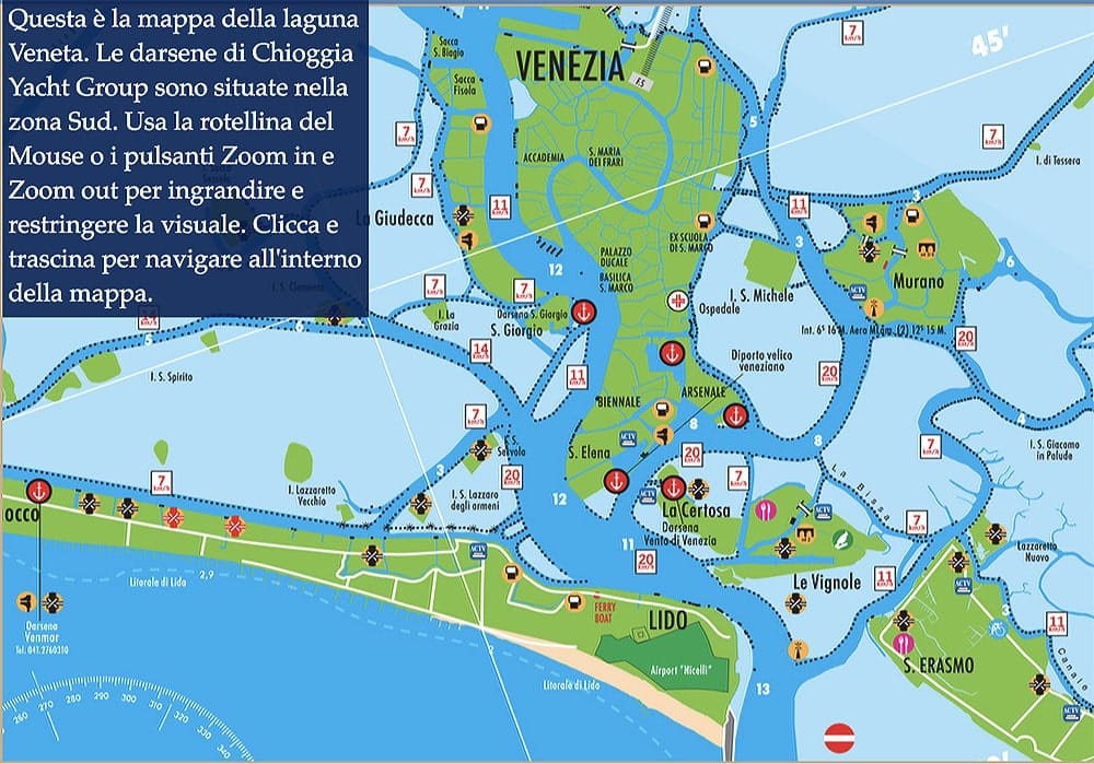 Для путешествия на яхте по каналам Венеции нужна навигационная карта: марины, мосты, шлюзы, расписание.