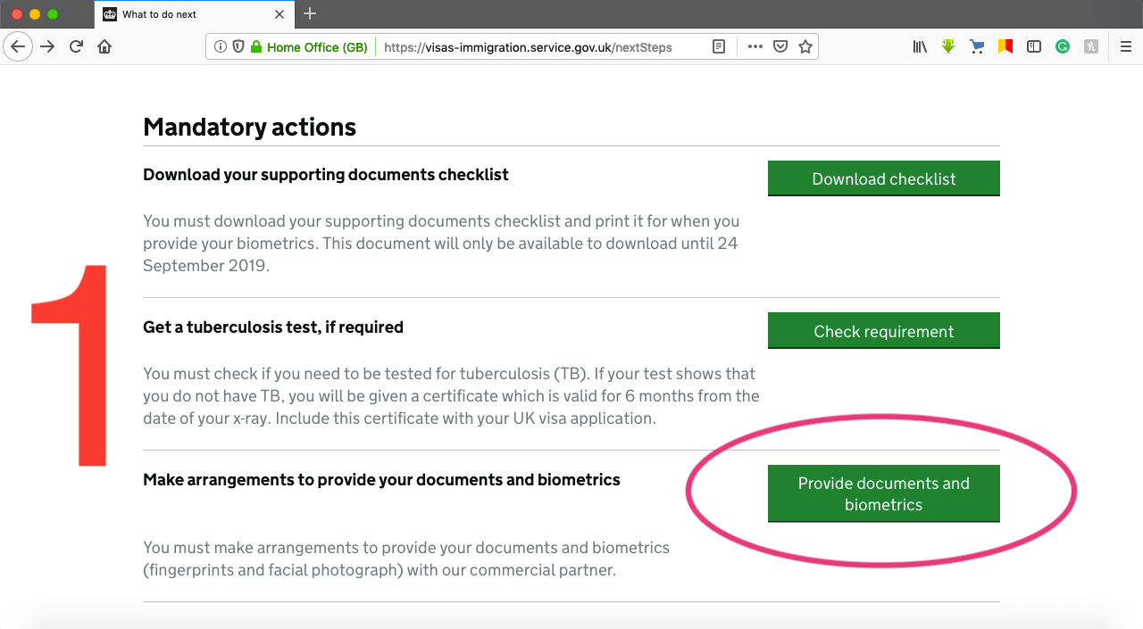 Переход на него автоматический, если нажать зеленую кнопку внизу, после заполнения анкеты на сайте GOV.UK — Provide documents and biometrics.