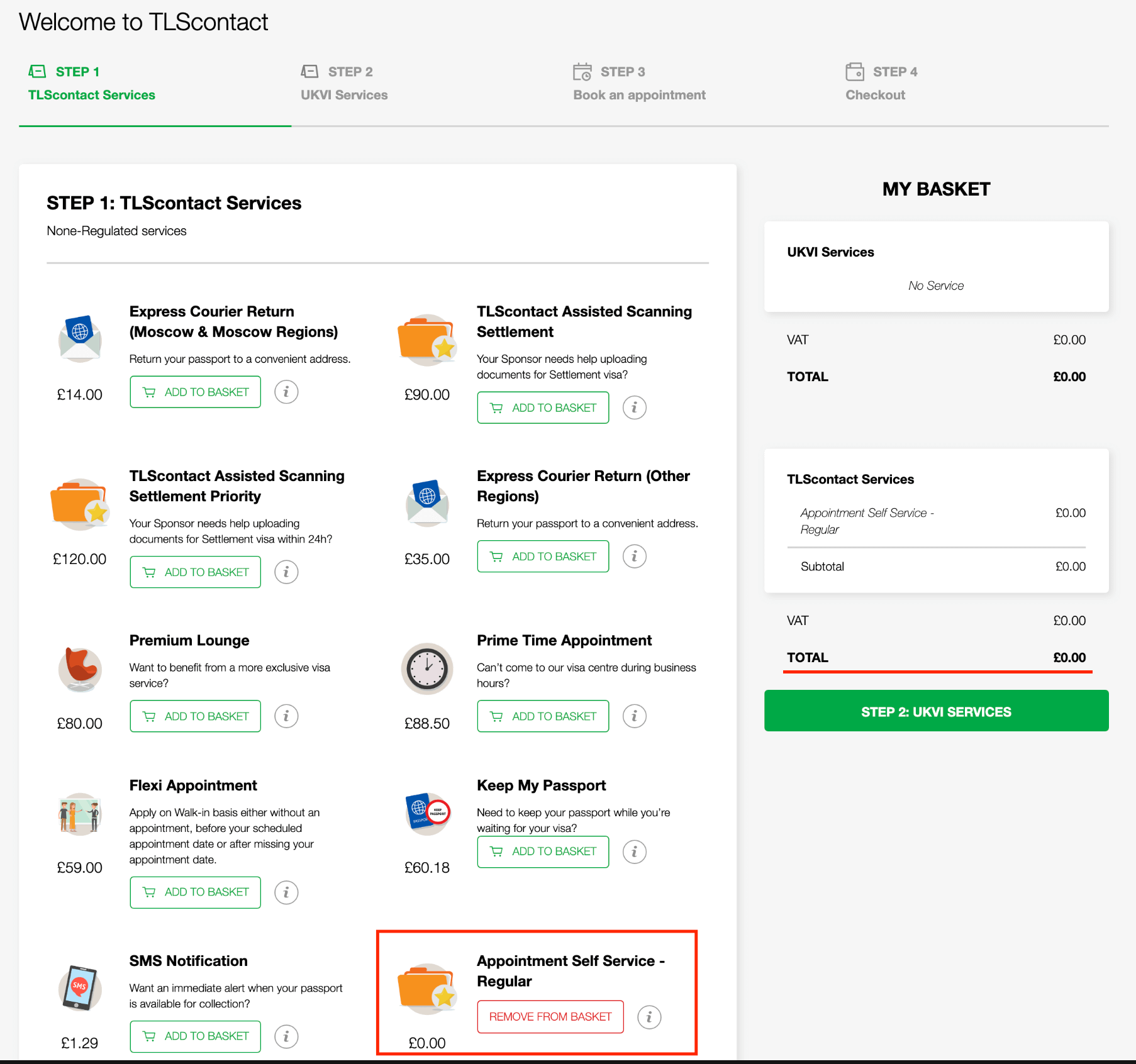 Если вам не нужны эти услуги — выбирайте опцию Appointment self service и жмите зеленую кнопку.
