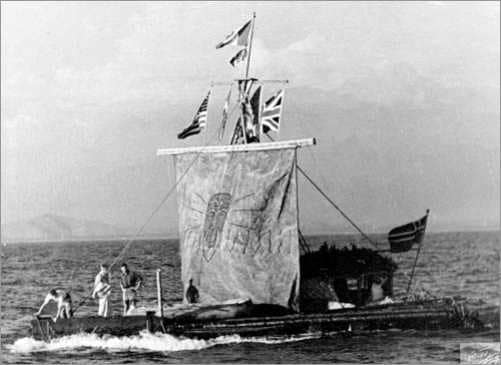 Переплыли на плоту сложенном из бревен бальсы, с небольшой избушкой и прямоугольным парусом на котором было изображено божество, которое как предполагал Тур Хейердал являлось божеством как для индейцев Южной Америки, так и для аборигенов с островов Полинезии. Короче — в интернете посмотрите суть истории, дело не в этом, а в фильме.