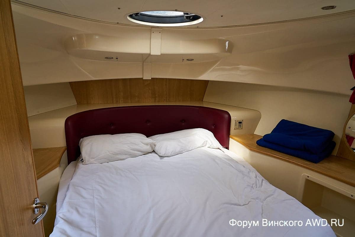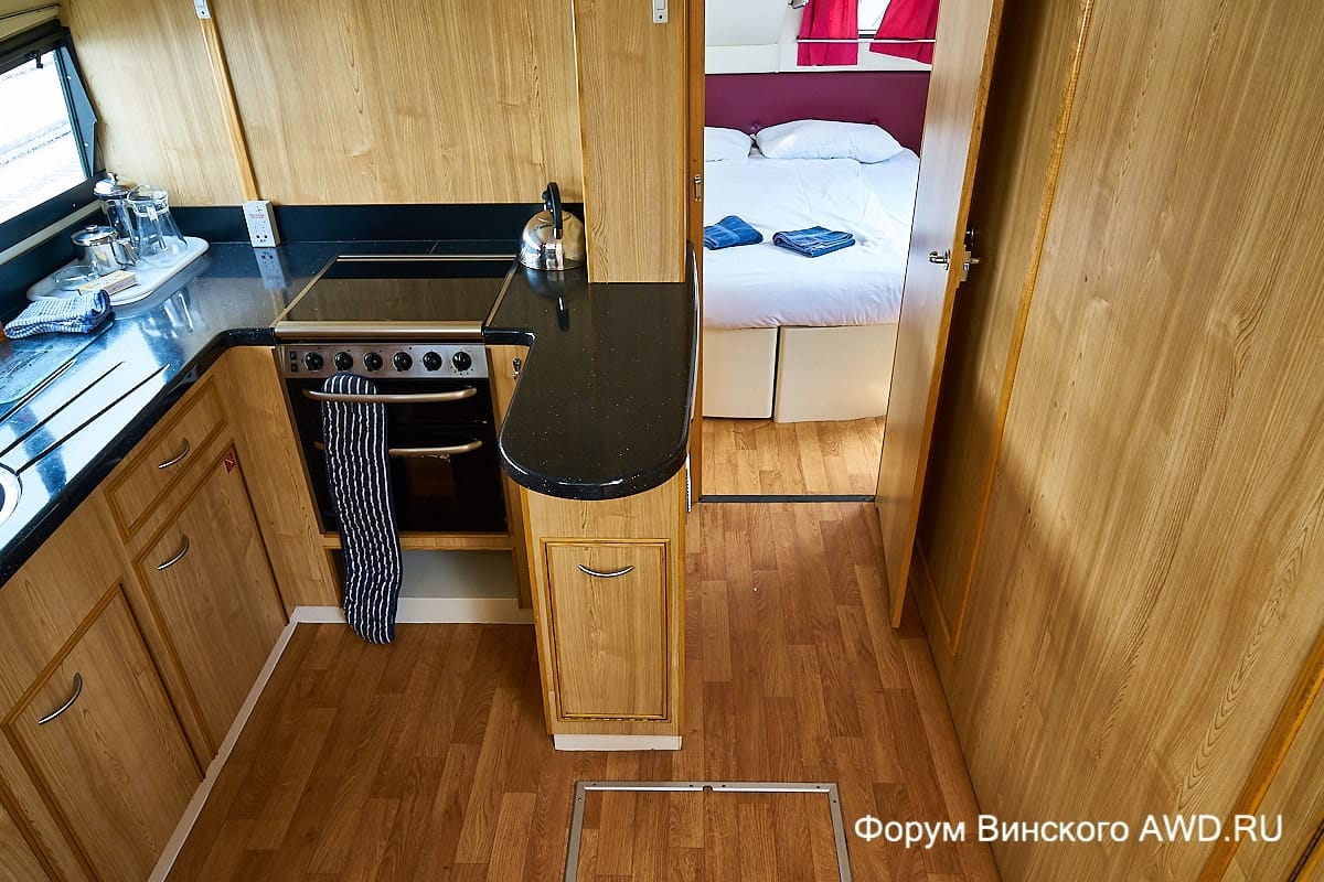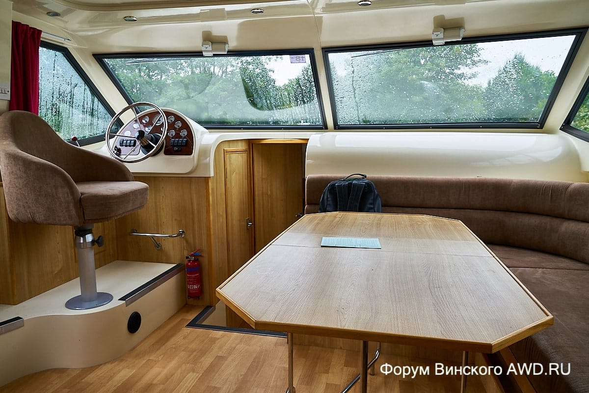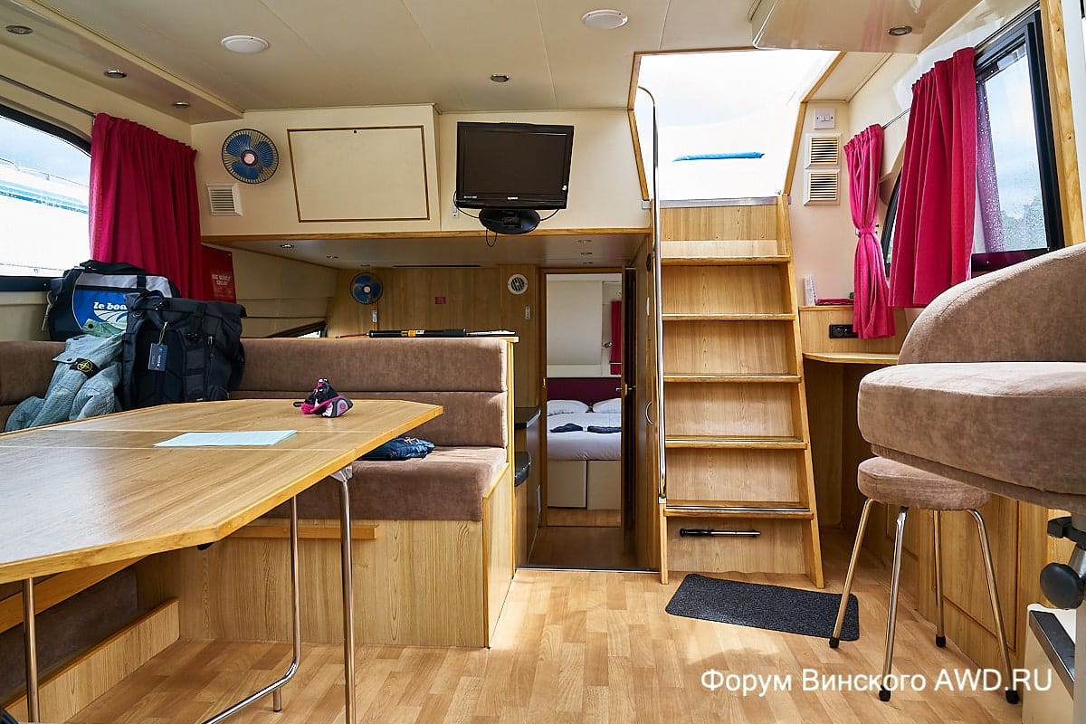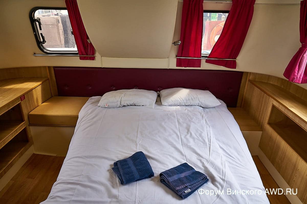 Многоуровневая компоновка пространства внутри хаусбота. На корме есть спальня + душ/туалет + кухня. На возвышении кают-компания и капитанское место. Носовая часть: душ, туалет, спальня в носовой части.