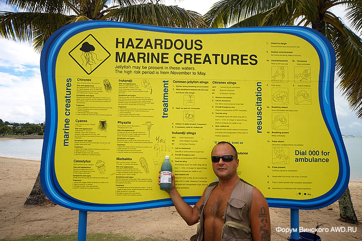 На пляжах Австралии, где нашествия медуз не событие, а ежедневно/сезонный риск, стоят контейнеры с уксусом.