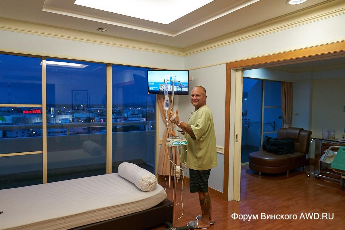 Капельница на колесиках, поэтому с ней ходил и в туалет.
