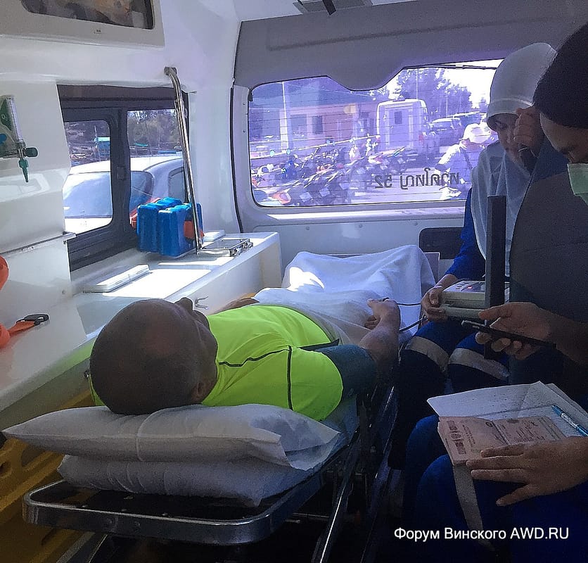 Встречала бригада скорой помощи на реанимобиле. Больного уложили на каталку, вызвав повышенное внимание всех ожидающих трансфера на пирсе.