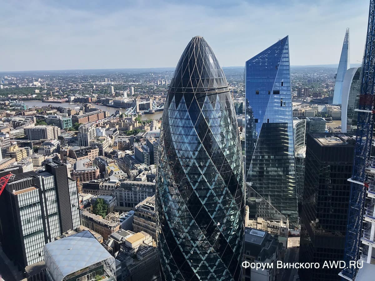 В ресторане есть открытая площадка, где можно сделать селфи напротив офисного небоскреба «Огурец» The Gherkin.