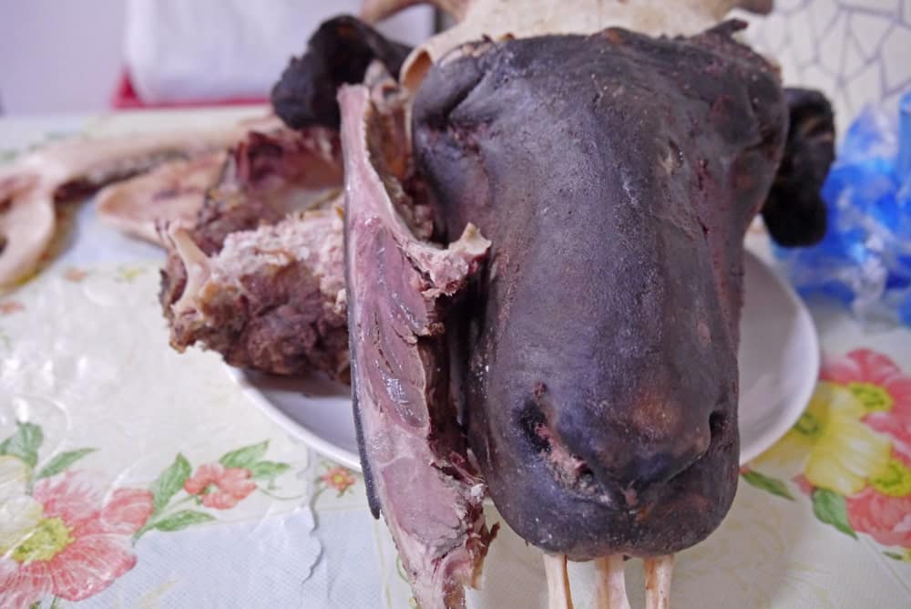 — варенные бараньи головы продаются на центральном рынке Улан Батора по цене 4000 тугриков за штуку.