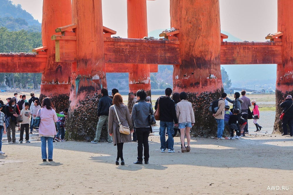 Тории обычно красного цвета и представляют из себя два столба соединённые сверху двумя перекладинами. Тории на острове Миядзима сделаны из камфорного дерева в 1875 году. Во время прилива они погружаются в воду, ну а во время отлива под ними можно пройти и сфотографироваться. Очень хороший знак, кстати