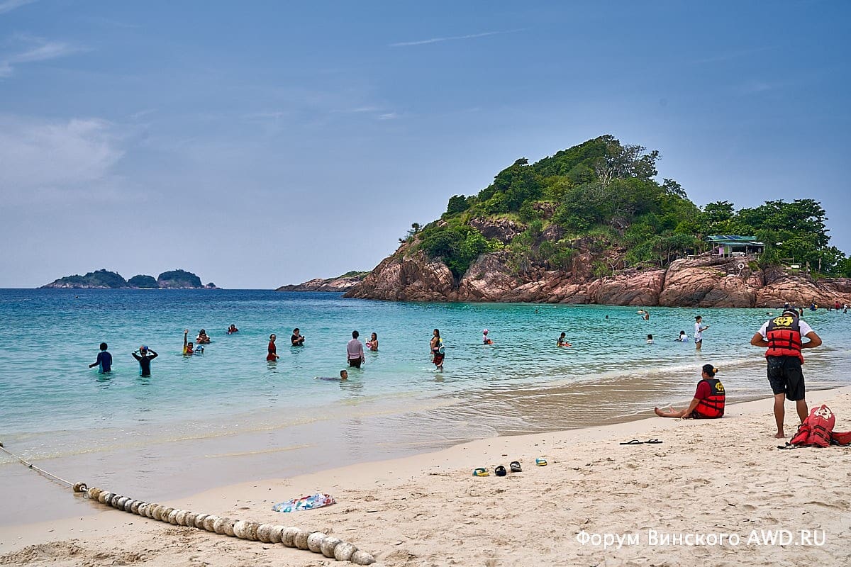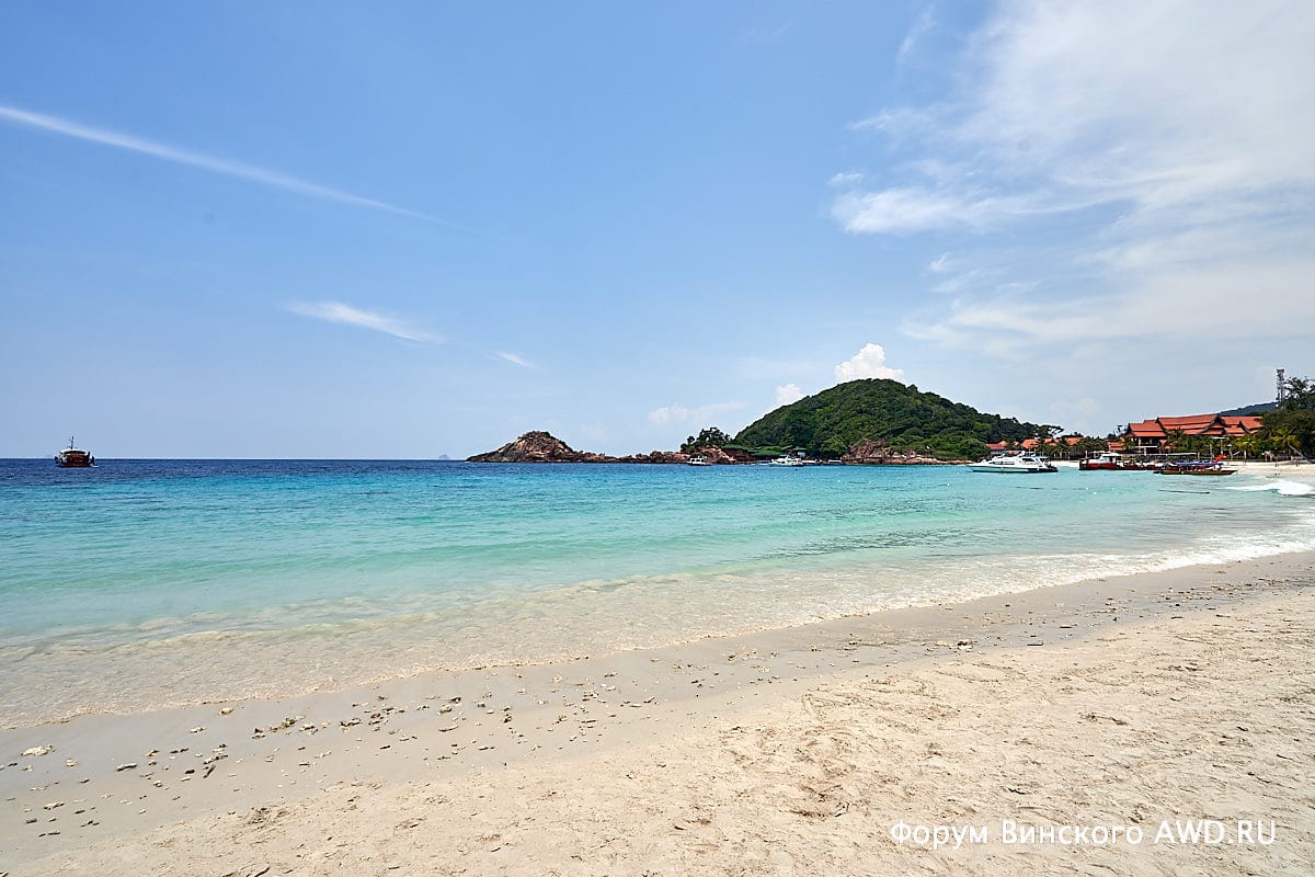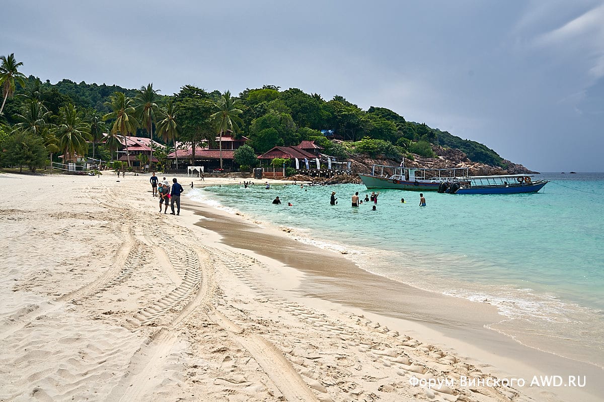 Пляж Long beach широкий, разделен скалой с рестораном Redang Moon на две части.