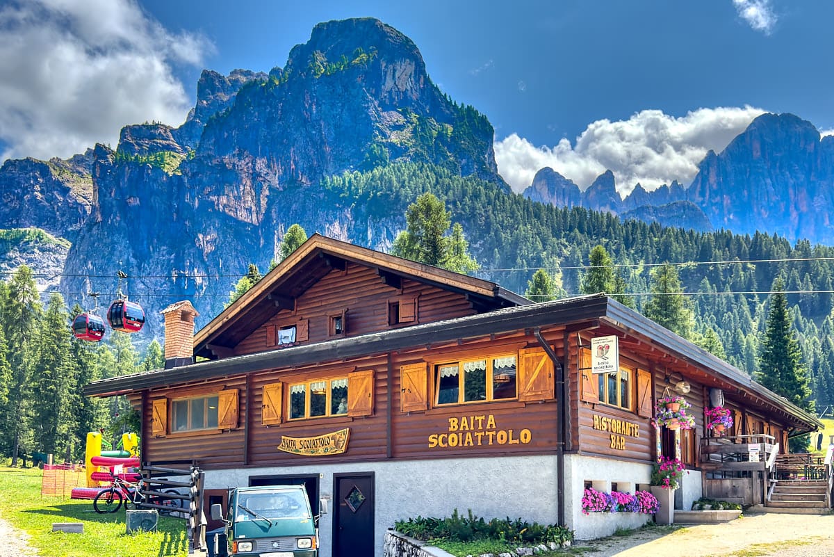 Завтрак в 7:30, сдаю номер, парковка у спортивного центра (5 € на весь день). Подъёмник Col dei Baldi за 22 € с QR‑кодом — покупка онлайн, рекомендую. Приятный бонус: навигация через komoot и указатели, но лучше быть первым — людей мало, виды потрясающие.