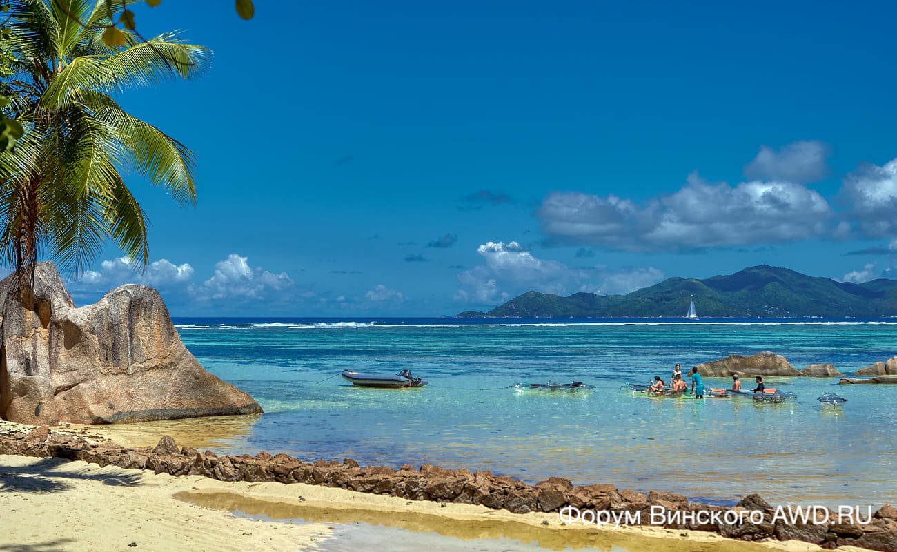 These rounded granite boulders are the postcard image of the Seychelles — framed by palm trees, turquoise water, and open blue sky.