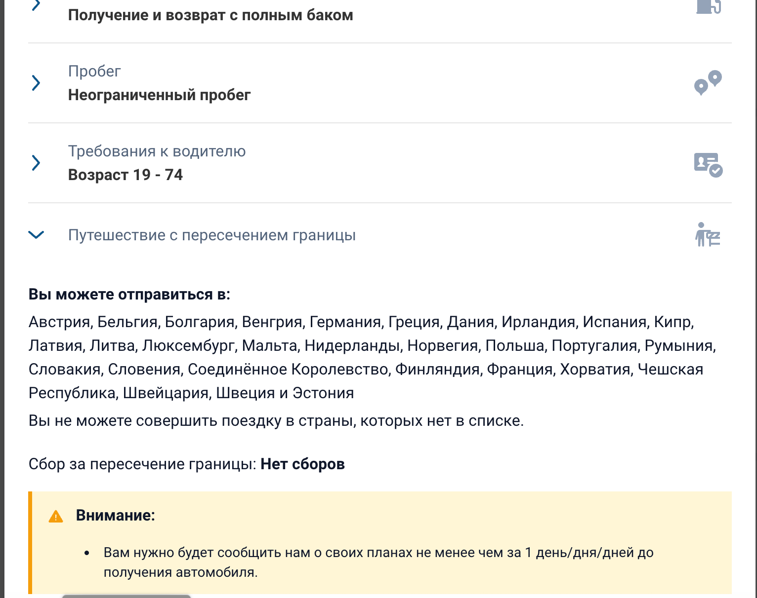 Кликнув на ссылку «Условия аренды» под картинкой авто, видишь список стран куда можно поехать, и стоимость пересечения границы.