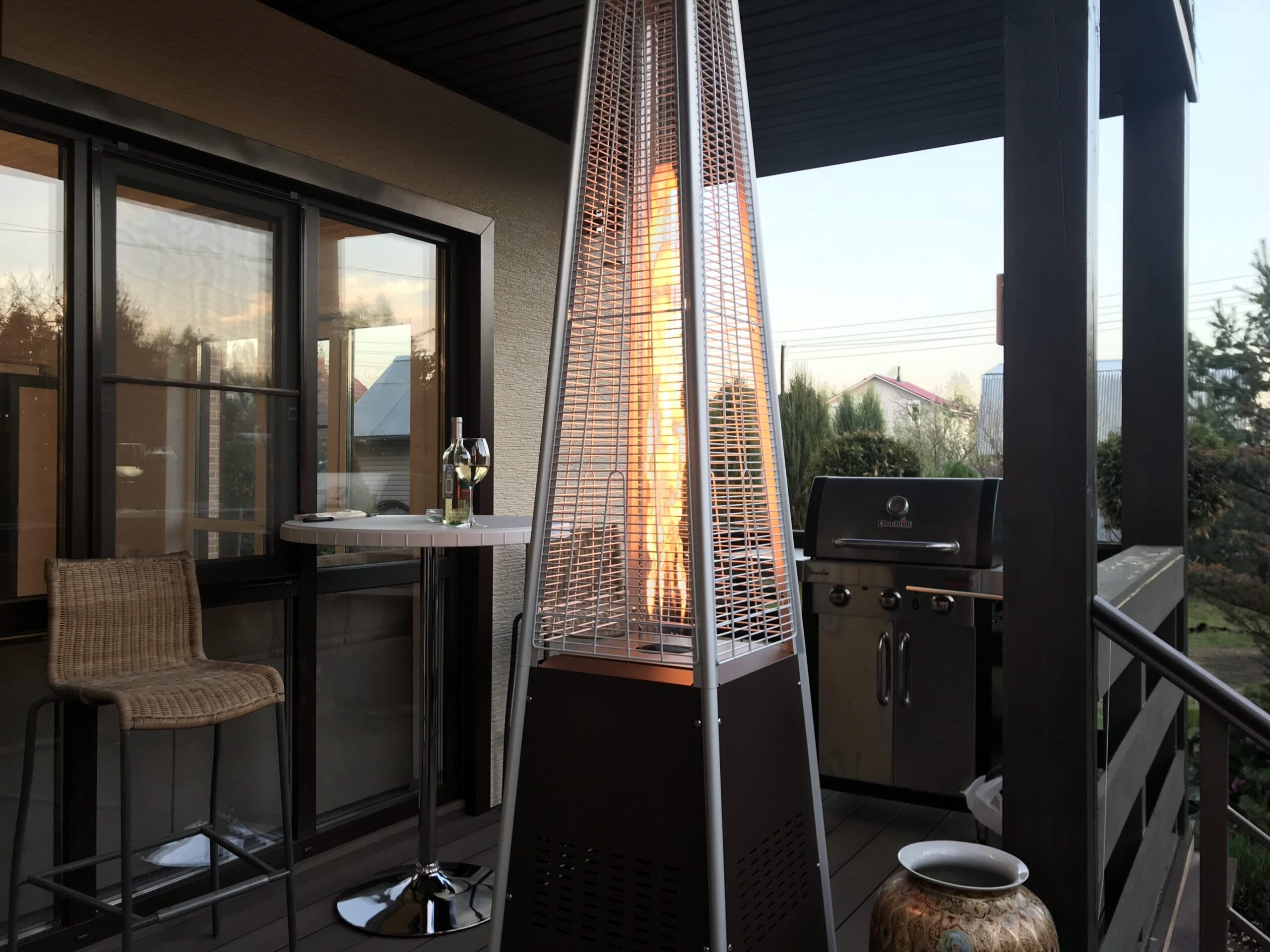 Уличный обогреватель собирался поставить на открытой террасе дома рядом с грилем.
