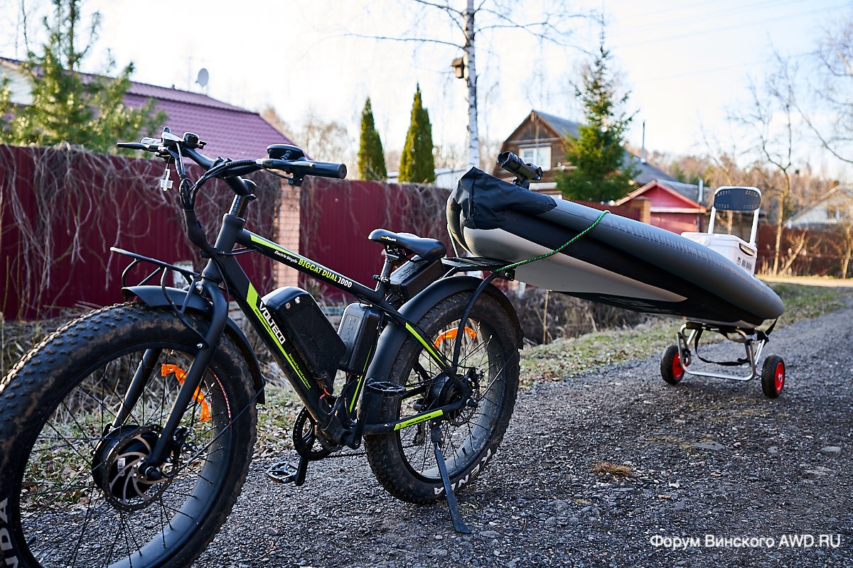 Попробовал прицепить все это к фэтбайку, купив дополнительно тележку для перевозки каноэ.
