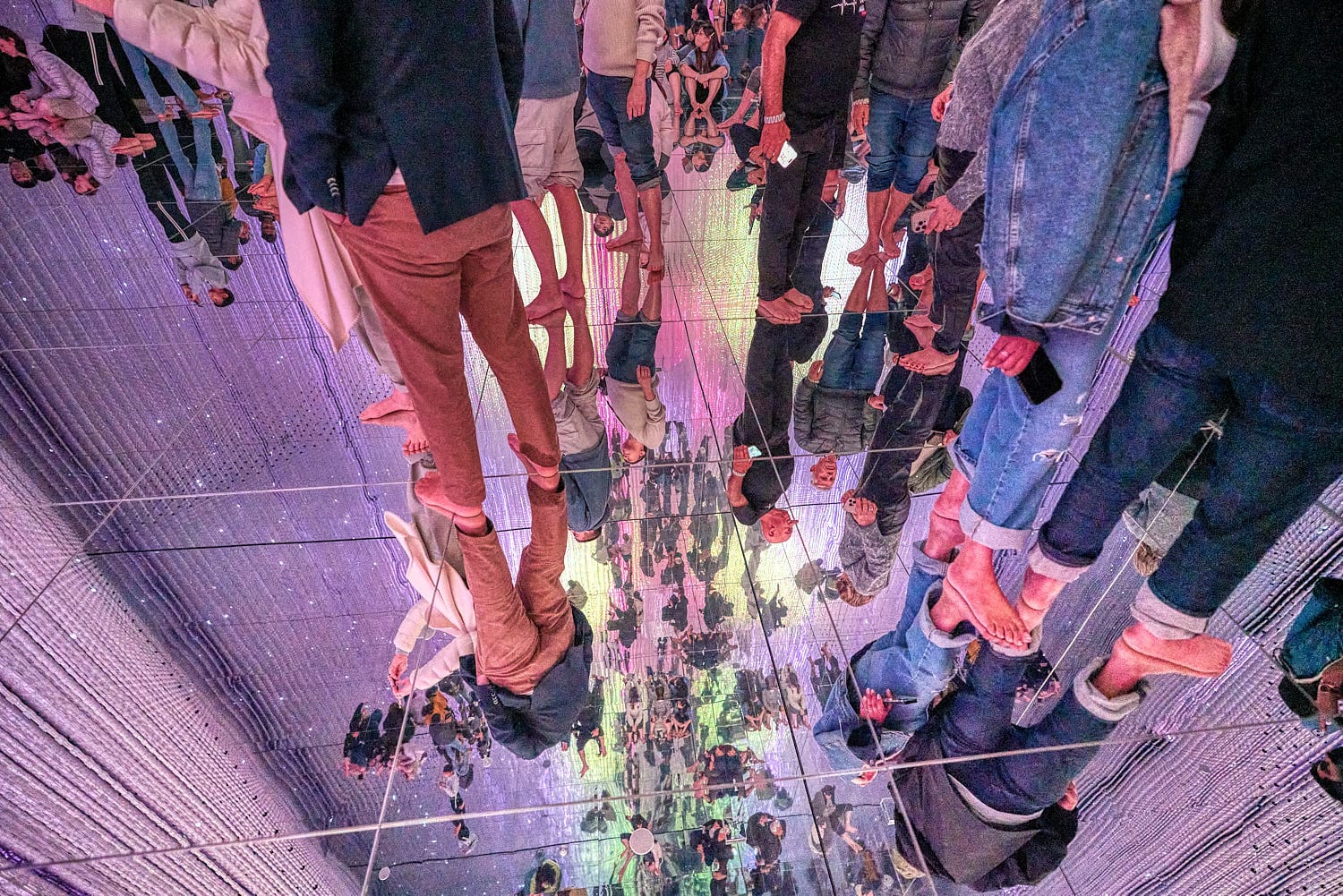 Перед входом заставляют снять обувь — часть экспозиции проходит по воде. Где-то идешь по колено в отражениях, где-то бродишь по зеркальному пространству, где-то пробираешься через мягкие поверхности.