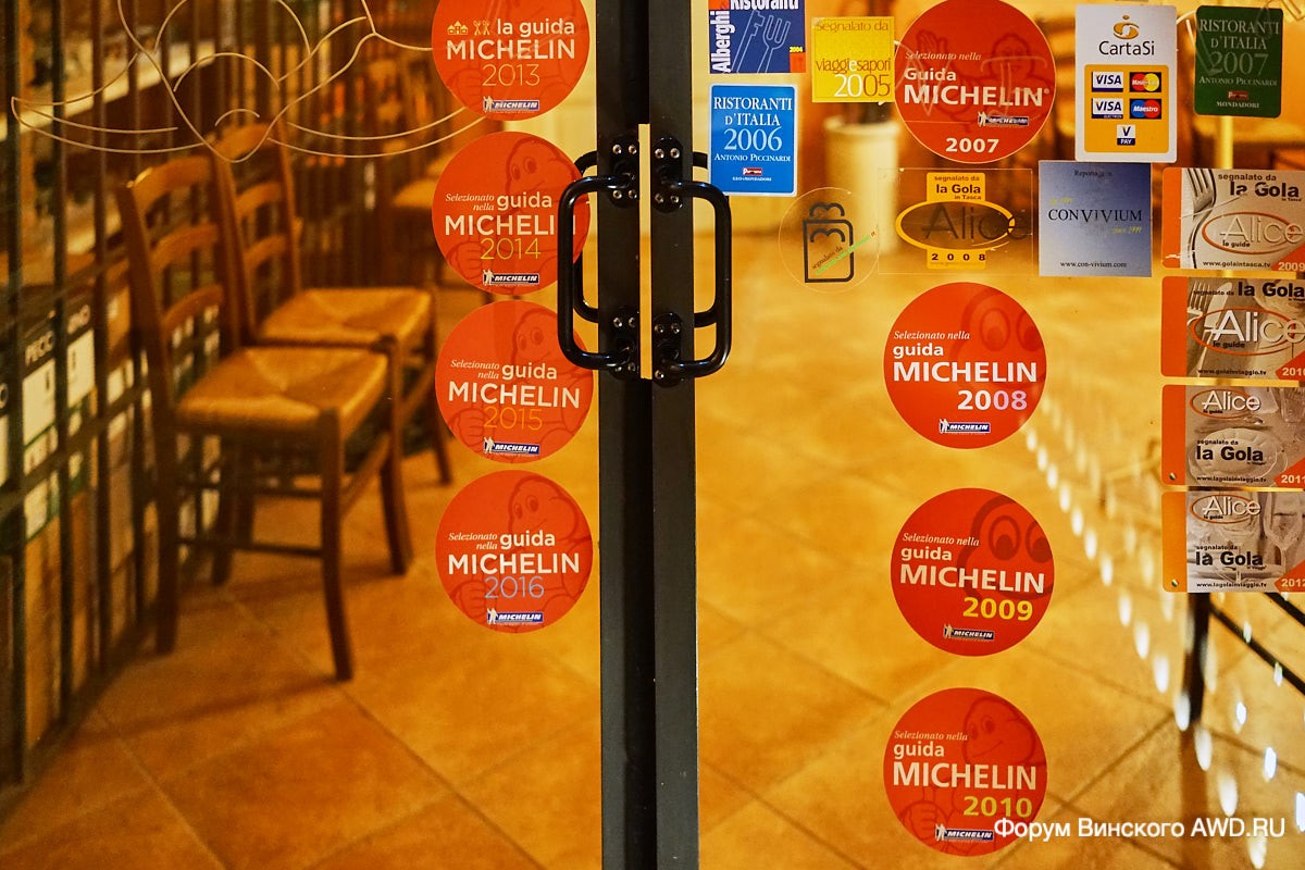 Остерия отмечена множеством красных наклеек Мишлен, но цены там почти демократичны.
