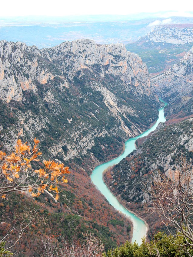 На горизонте виднеется озеро, а на дне каньона можно разглядеть голубой шнурок речки Вердон.