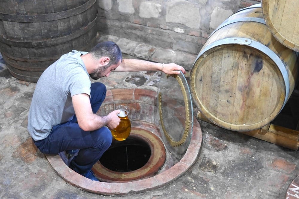 Молча открыл крышку одной квеври и зачерпнул оттуда белое Ркацители.