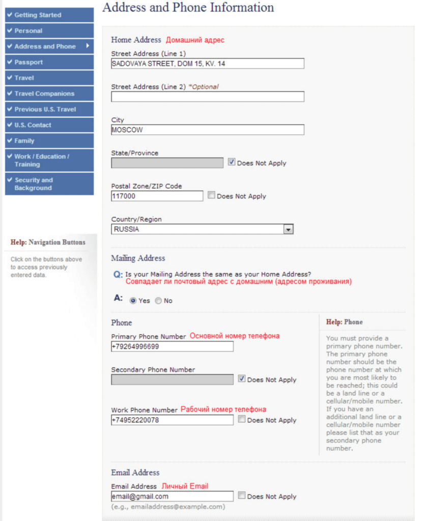 Шаг 10 : Ваши контакты в США — напишите адрес отеля в США, бронировать его не надо.
